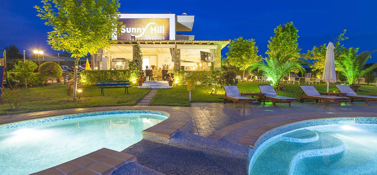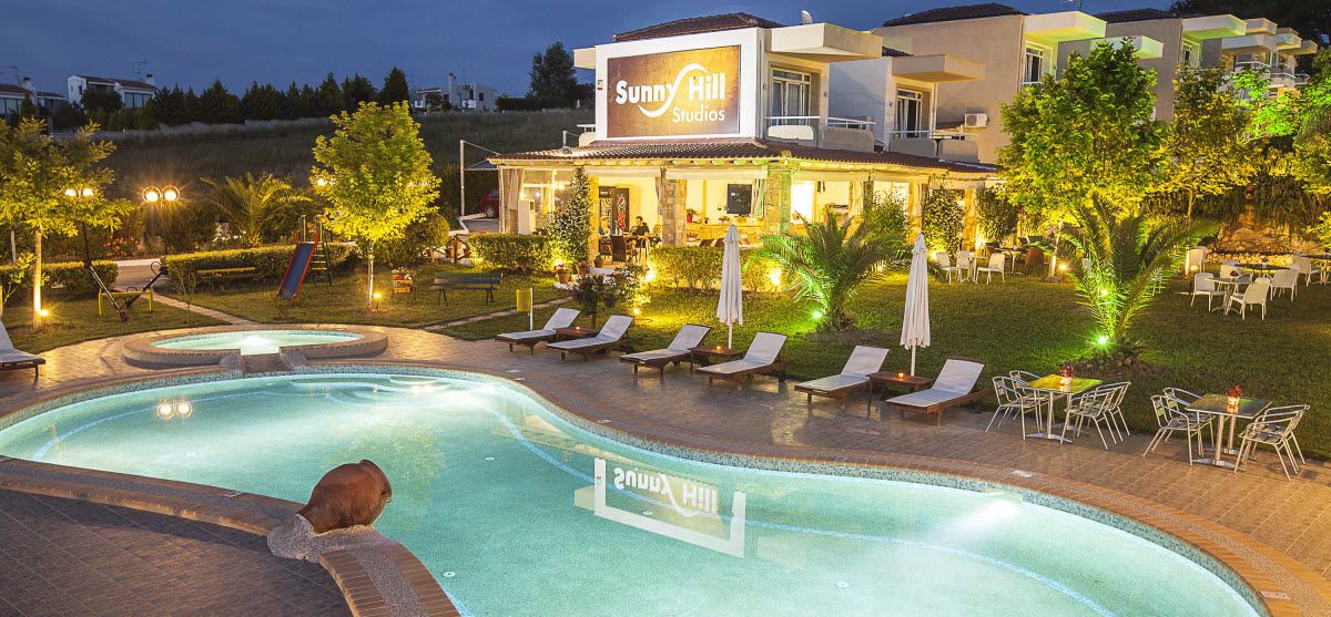 Sunny Hill located in Sani Beach (Kassandra Halkidiki) is a family hotel that offers affordable luxury for your unforgettable Summer holidays in Greece. Our hotel has 14 double rooms, 1 junior suite and a family suite to accommodate you, a restaurant serving Greek and Mediterranean cuisine, an outdoor swimming pool and children pool, modern wooden sunbeds for sunbathing, a pool bar to enjoy your coffee, cocktails, wine or a fruit salad, a play yard for children and of course free parking lot.